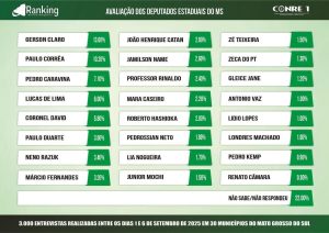 O deputado estadual Pedro Caravina (PSDB) está entre os três parlamentares mais bem avaliados da Assembleia Legislativa de Mato Grosso do Sul, de acordo com pesquisa realizada pelo Instituto Ranking Brasil Inteligência, encomendada pela Rede de Rádios Top FM. O levantamento ouviu 3 mil pessoas em 30 municípios do Estado entre os dias 1º e 6 de setembro. A margem de erro é de 1,8 ponto percentual, com nível de confiança de 95%