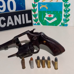 De posse dessas informações, a Guarnição PM realizou diligências, localizando o jovem no bairro Jardim Balneário, os militares o abordaram e após busca pessoal, o indagaram sobre as acusações de ameaça e porte de arma de fogo. O jovem de 23 anos confirmou ter ido até a residência da adolescente de 15 anos e que a arma estava escondida em seu imóvel, autorizando a equipe PM realizar a busca. Os policiais militares encontraram no quarto do jovem um revólver calibre .22, marca Rossi, com 08 (oito) munições intactas.